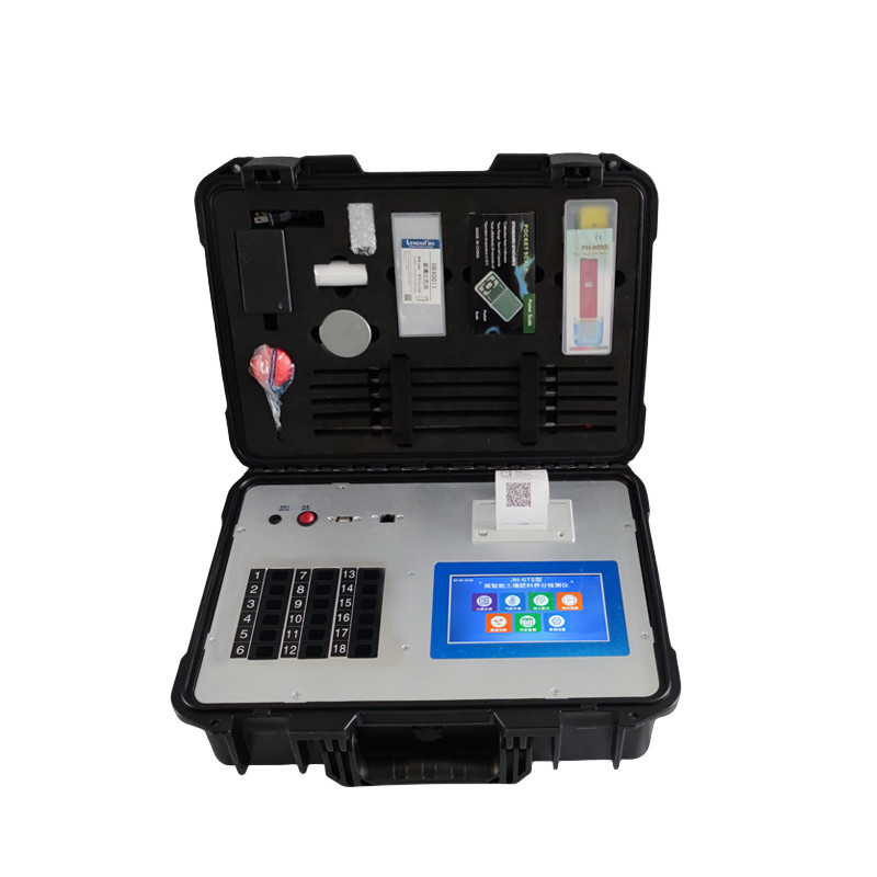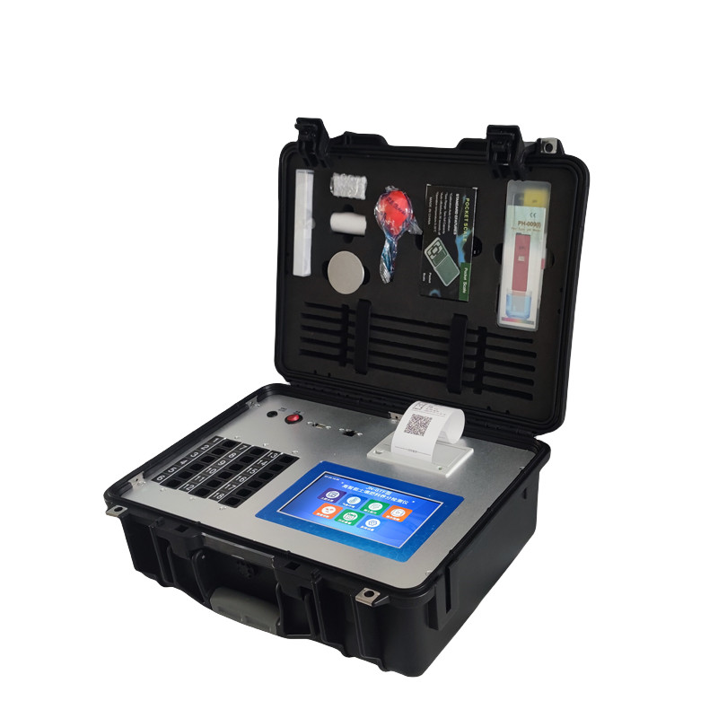 仪器箱:主机(内置锂电池、打印机)1台,比色皿12个,电子天平(200g/0.01g)1个,刻度吸管1、2、2、5、10mL各1支,洗耳球1个,小铝盒1个,直流12V充电器1个,pH计一个,盐分电导笔一个,说明书、合格证1套。
