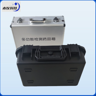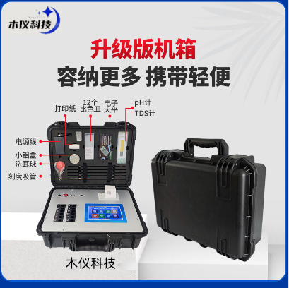 34.高强度PVC工程塑料+手提铝合金箱设计,坚固耐用,便于携带,供电方式为交直流两用,可野外流动测试配套成品药剂。